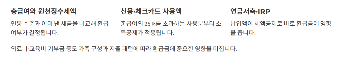 연말정산 미리보기 환급금 조회 방법에서 가장 핵심이 되는 부분은 결국 어떤 항목이 환급액을 좌우하는지를 이해하는 것입니다.