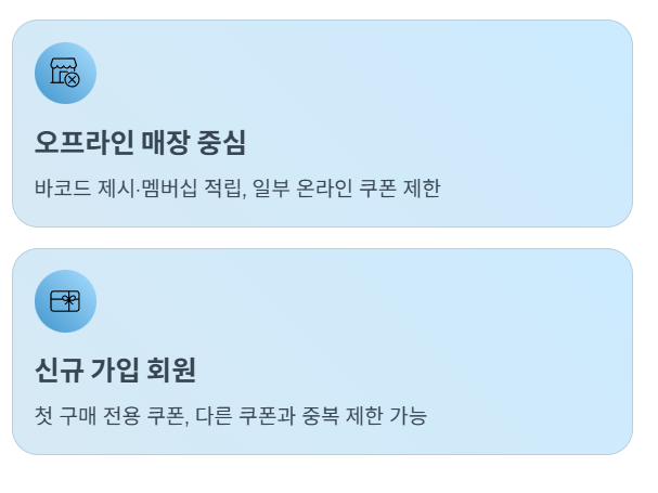 - 오프라인 매장 중심 이용자 : 매장 바코드 제시와 멤버십 적립이 중심인 유형으로, 일부 온라인 전용 쿠폰·중복쿠폰은 사용이 제한될 수 있습니다.
