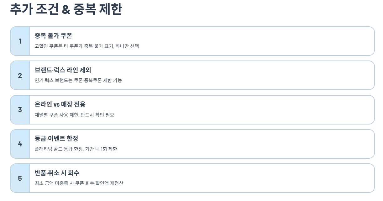 - 등급·이벤트 한정 쿠폰 : 플래티넘·골드 등 등급 한정 또는 특정 이벤트 참여자 한정 쿠폰은 타인 계정에서 사용할 수 없으며, 기간 내 1회 제한이 붙는 경우가 많습니다.