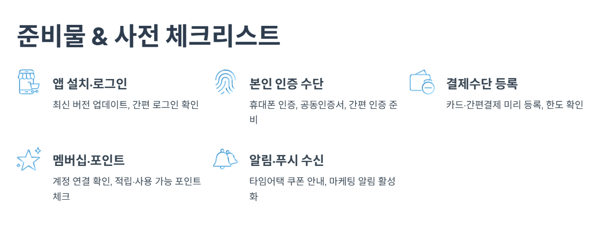 실제 결제 전에 준비해 두면 좋은 것은 앱·계정·결제수단·알림 설정입니다. 대부분 정보는 시스템에 저장되어 있지만, 결제 직전에 인증 오류나 한도 문제로 결제가 끊기면 시간 제한 쿠폰을 놓칠 수 있으니, 미리 점검해 두시면 훨씬 수월하게 진행하실 수 있습니다.