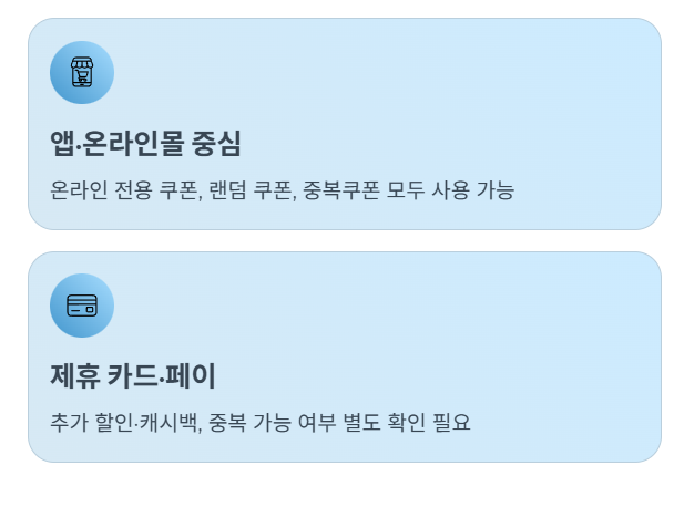 - 제휴 카드·페이 이용자 : 특정 카드사·간편결제사를 통해 추가 할인 또는 캐시백을 받는 유형으로, 기본 쿠폰과 중복 가능 여부를 별도로 확인해야 합니다.
