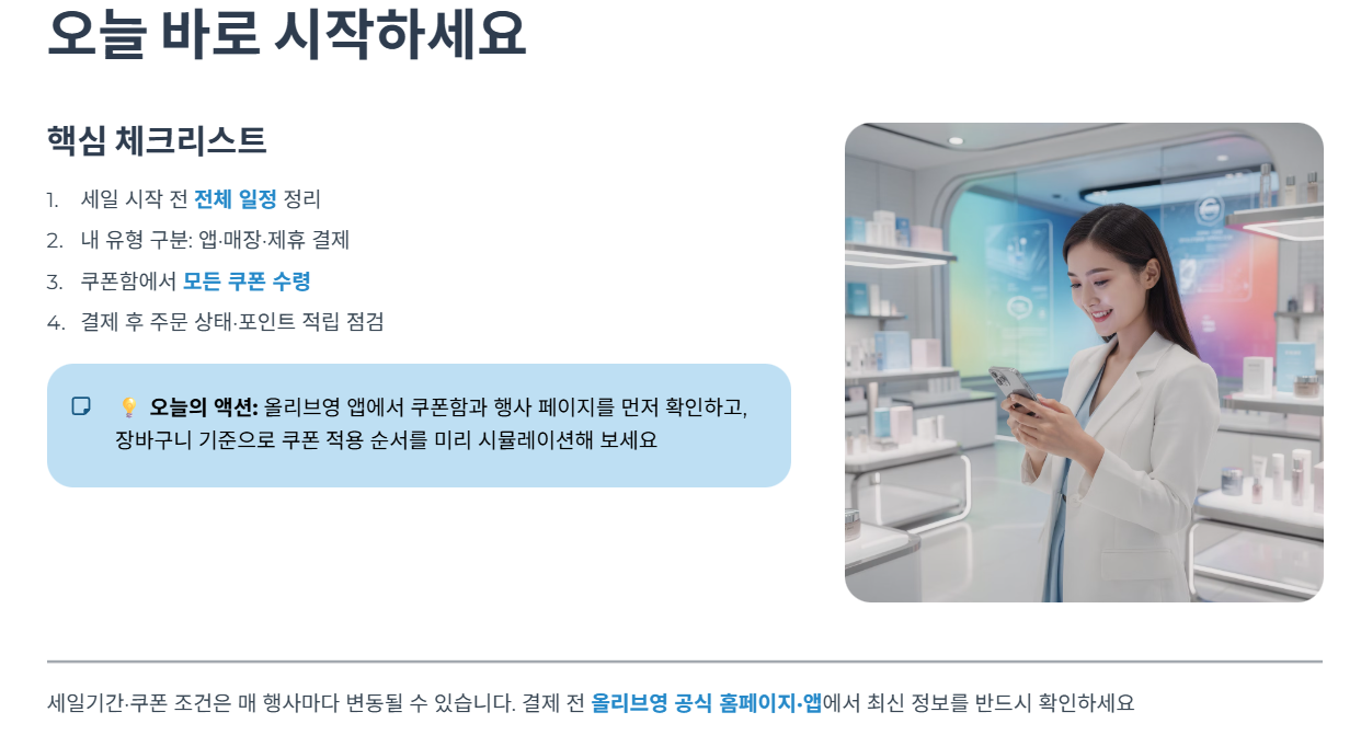 다만 세일기간·쿠폰 종류·중복 가능 여부·참여 브랜드·결제 혜택 조건은 매년, 심지어 매 행사마다 조금씩 달라질 수 있습니다. 따라서 이 글은 흐름 이해를 위한 안내로 참고하시되, 실제 결제 전에 반드시 올리브영 공식 홈페이지·앱의 행사 페이지와 쿠폰 사용 안내, 공지사항에서 최신 정보를 다시 확인해 주시길 권장드립니다.