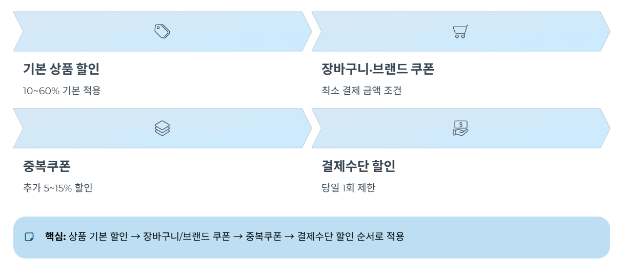 - 상품 할인 → 장바구니/브랜드 쿠폰 → 중복쿠폰 → 카드·페이 결제 할인 순으로 적용되는지 결제 창에서 순서를 한 번 더 체크합니다.