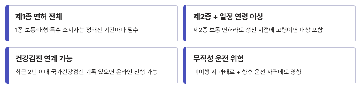- 건강검진 연계: 최근 2년 이내 국가건강검진을 받은 경우, 일부 연령·면허 유형은 건강검진 결과를 활용해 온라인으로 절차를 진행할 수 있습니다.