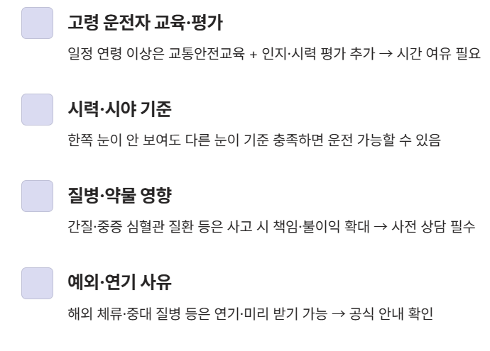 연령이 높거나 특정 질병·장애가 있는 경우에는 일반 운전자와 다른 기준이 적용될 수 있어, 이를 모르고 진행하면 불필요한 반려·재검사를 반복하게 됩니다.