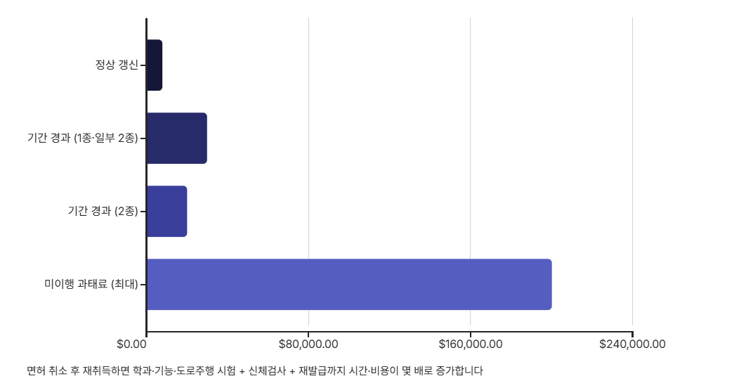 - 면허 취소 후 재취득 비용: 정기 적성검사를 받지 않고 일정 기간을 넘겨 면허가 취소되면, 학과·기능·도로주행 시험과 신체검사, 재발급까지 다시 준비해야 해 여러 차례 수수료와 시간 비용이 추가됩니다.