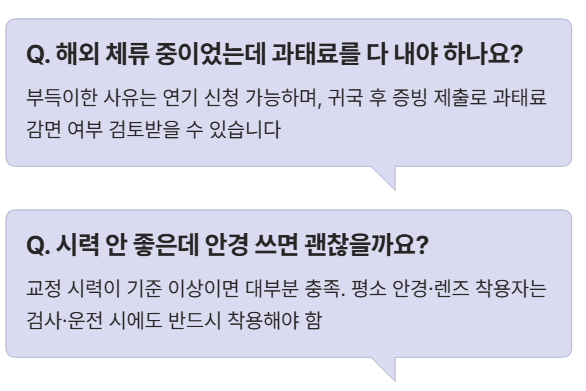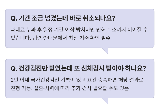 정기 적성검사·갱신은 몇 년에 한 번 하는 일이다 보니, 기한을 살짝 넘겼을 때나 해외 체류·건강 상태가 특별한 경우에는 특히 헷갈리는 부분이 많습니다.