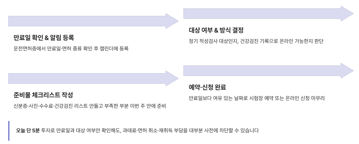 - 과태료와 면허 취소 위험을 피하기 위해, 만료일보다 여유 있는 날짜로 시험장 예약 또는 온라인 신청을 마무리합니다.