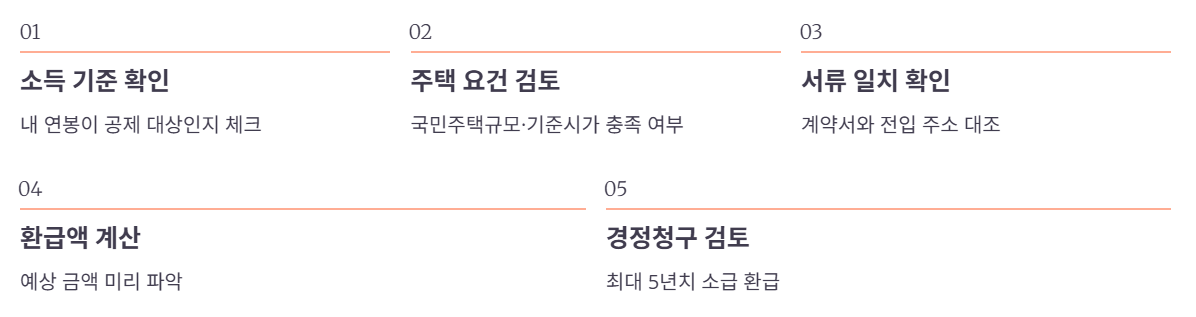 - 임대차계약서·주민등록등본·월세 이체 내역을 연도별로 정리해 두고, 추후 경정청구까지 염두에 두고 보관합니다.