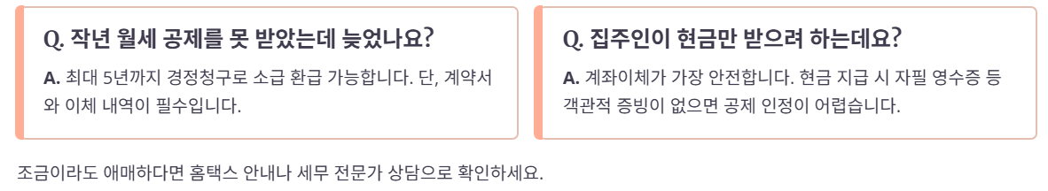 - Q. 집주인이 현금으로만 받자고 해서 현금 지급만 했는데 괜찮나요? A. 가능하면 계좌이체처럼 기록이 남는 방식이 가장 안전합니다. 이미 현금으로 지급했다면 자필 영수증·입금증 등 객관적인 증빙이 없으면 공제 인정 자체가 어렵거나, 나중에 분쟁으로 이어질 수 있습니다.