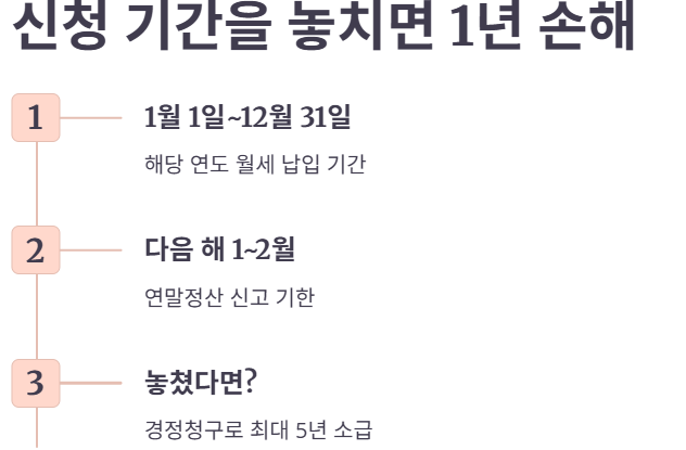 월세 공제는 “언제 냈는지”와 “언제까지 신청했는지” 두 타이밍을 놓치면, 그 해 공제 기회가 통째로 사라져 바로 손해로 이어집니다.