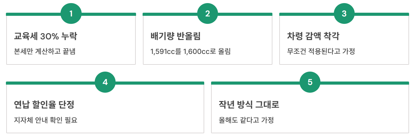 자동차세 계산이 어려운 게 아니라, 사람들이 같은 지점에서 반복해서 틀립니다. 아래 5가지만 피해도 고지서와의 차이가 확 줄어요.