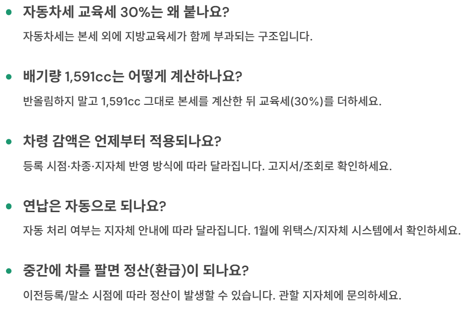 FAQ의 결론은 같습니다. 교육세 포함, 반올림 금지, 차령·연납은 조회로 확정하면 됩니다.