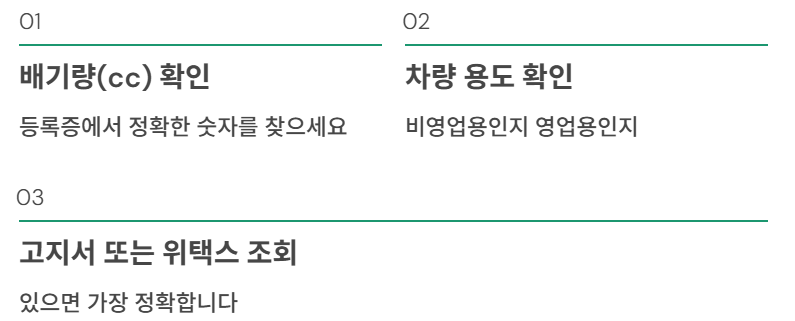 - 배기량(cc) 확인 → 구간별 cc당 세액 선택