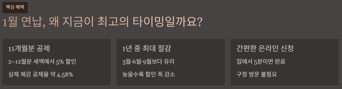 할인만 보면 1월이 가장 유리합니다. 다만 “계산값”은 참고용이고, 결제 직전 화면에 뜨는 “연납 납부 금액”이 실제 납부액입니다.