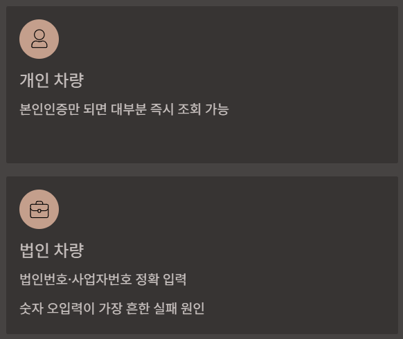 - 법인차량: 사업자번호/법인번호 입력 오류가 가장 흔한 실패 원인