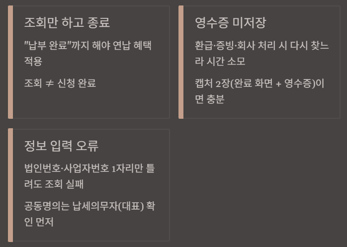 가장 흔한 실패는 “조회만 하고 종료”입니다. ‘납부 완료’까지 해야 연납이 적용됩니다.