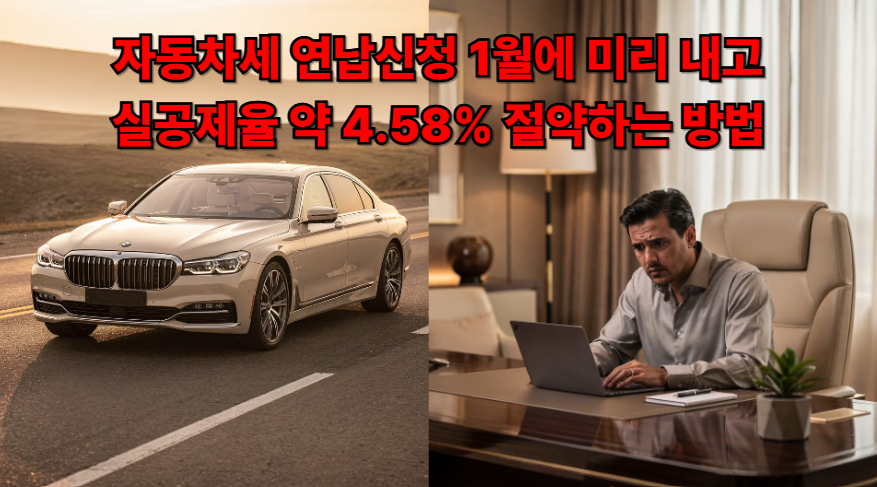 자동차세 연납은 “1년치 자동차세를 한 번에 내면 그냥 할인”이 아니라, 보통 남은 기간(특히 1월은 2~12월 11개월분)의 세액에서 일정 비율을 공제받는 구조로 안내됩니다. 그래서 1월에 연납하면 체감상 연세액 기준 실공제율이 약 4.58%로 많이 안내돼요.