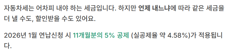 2026년 1월 연납은 일반적으로 2~12월(11개월분) 세액의 5% 공제로 안내되며, 이를 연세액 기준으로 환산하면 실공제율 약 4.58% 수준으로 표시되는 경우가 많습니다. 다만 최종 금액은 차량 용도·배기량, 감면 적용, 지역 고지 기준에 따라 달라질 수 있어요. 그래서 “대략 계산”은 참고만 하고, 납부 화면에 찍히는 금액이 최종입니다.