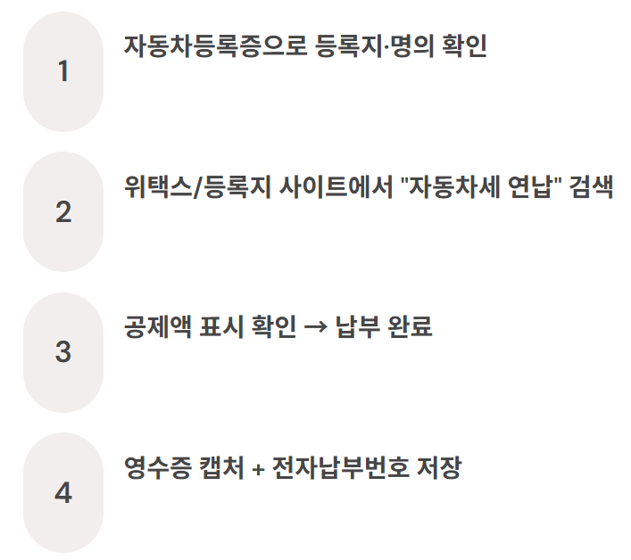 연납 성공 공식은 간단합니다: 등록지 기준으로 조회 → 공제액 표시 확인 → 납부 완료 → 영수증 저장. 여기까지가 한 세트입니다.
