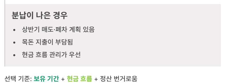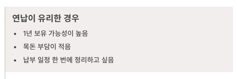 | 돈(할인) | 1년 보유 가능성이 높고, 목돈 부담이 적을 때 | 당장 목돈 지출이 부담이라 분납이 편할 때 |
