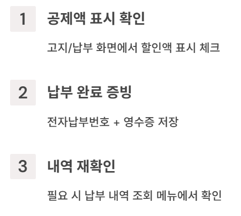 | 증빙 보관 | 오류/이중납/정산 문의 시 해결 속도를 좌우 | 영수증 캡처 + 전자납부번호 저장 |