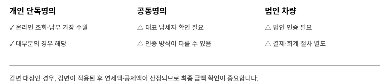- 개인 단독명의: 온라인 조회·납부가 가장 수월한 편