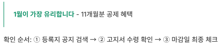 기간 핵심은 “1월이 가장 유리”입니다. 다만 마감일은 지역별로 다를 수 있으니 등록지 공지/고지서 문구로 최종 확인하세요.