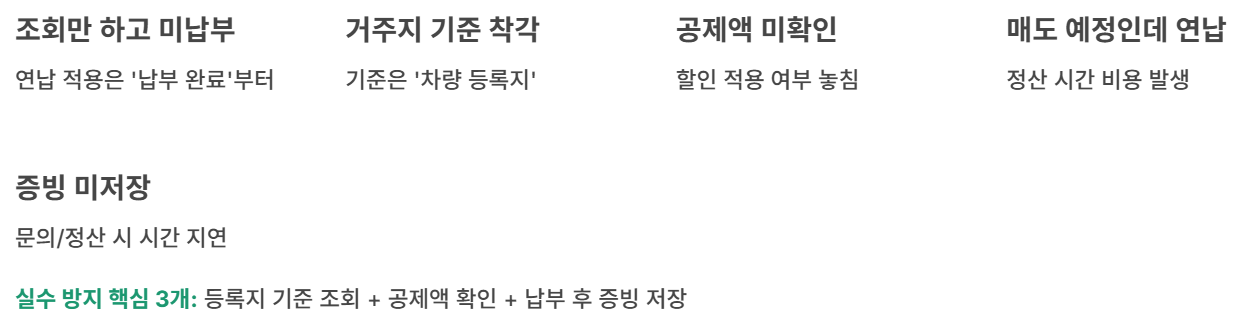 실수 방지의 핵심은 3개입니다: 등록지 기준 조회, 공제액 확인, 납부 후 증빙 저장. 이 3개만 지켜도 실패 확률이 크게 줄어듭니다.