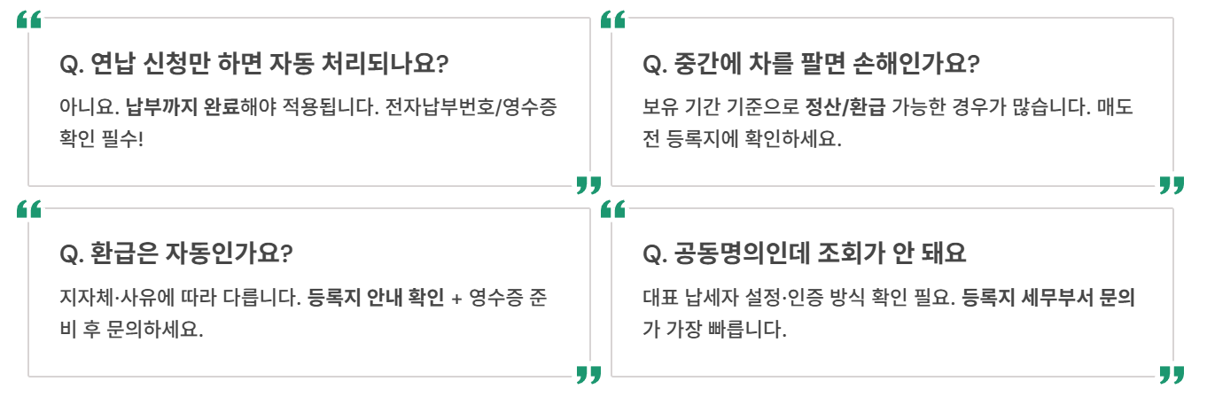 FAQ의 결론은 단순합니다: 연납은 납부 완료까지, 기준은 등록지, 금액은 고지/납부 화면이 최종. 여기만 잡아도 헷갈림이 크게 줄어요.