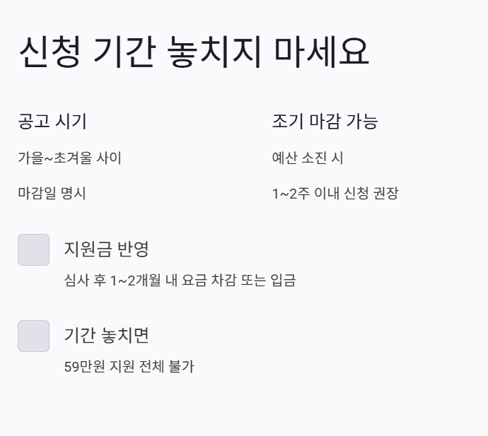- ④ 신청 기간을 놓치면 한 시즌 기준 최대 59만원 수준의 지원을 통째로 받지 못할 수 있어, 마감일과 예산 소진 여부를 꼭 확인하셔야 합니다.