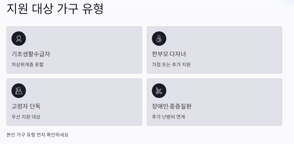 먼저 내가 속한 복지 자격·가구 유형을 정리해 두시면, 이후 카드에서 설명하는 조건·서류·지원 금액을 훨씬 빠르게 이해하고 적용하실 수 있습니다.