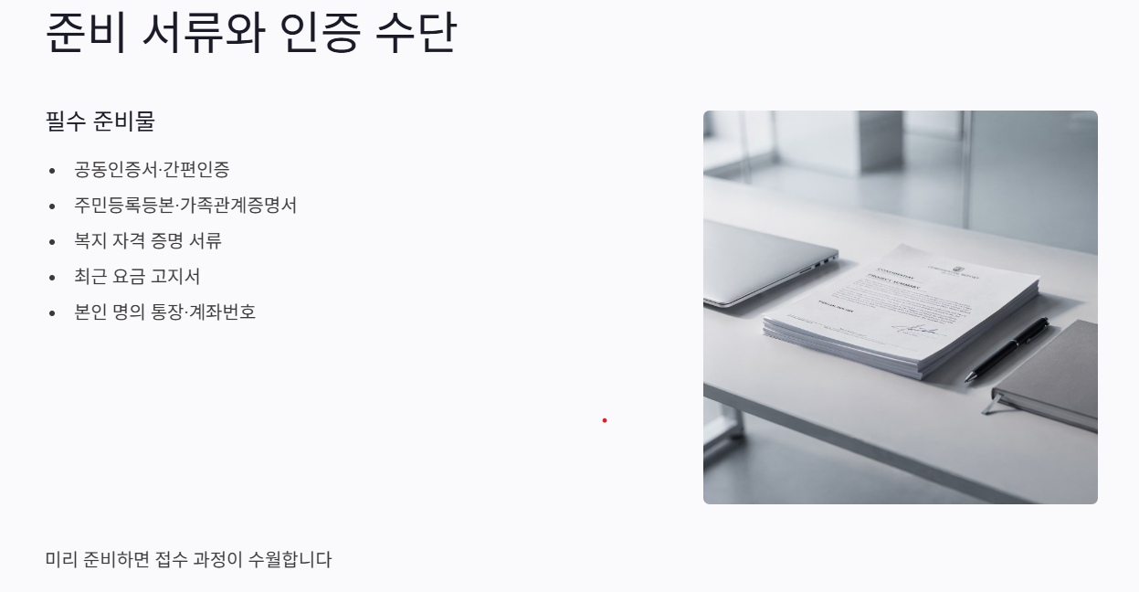 - ③ 등본·복지 자격 증명·요금 고지서 등 필수 서류와 인증 수단을 오늘 안에 한 번 모아서 점검합니다.