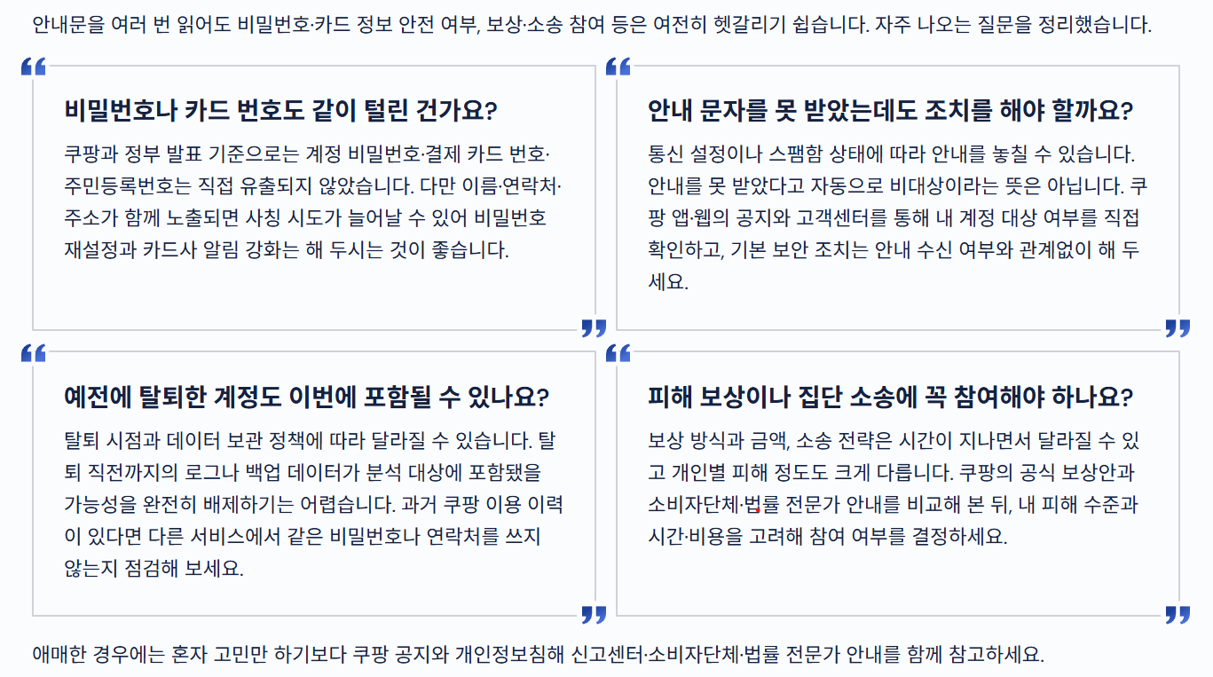 안내문을 여러 번 읽어도 비밀번호·카드 정보 안전 여부, 안내 미수신 시 대응, 탈퇴 계정 처리, 보상·소송 참여 여부 등은 여전히 헷갈리기 쉽습니다.