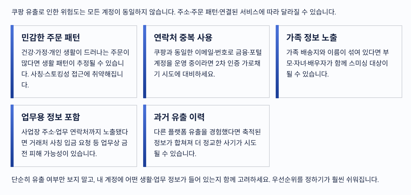 - 민감한 주문 패턴이 있는 경우: 건강·가정·개인 생활이 드러나는 주문 내역이 많은 계정은, 생활 패턴이 어느 정도 추정될 수 있어 사칭·스토킹성 접근에 취약해질 수 있습니다.