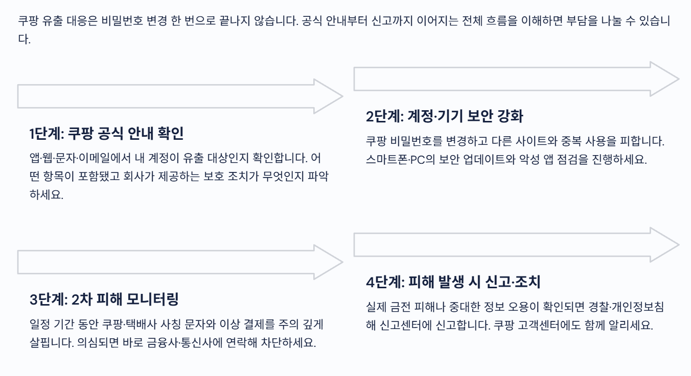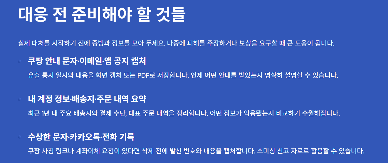 - 실제 금전 피해나 추가 유출 정황이 의심되면 쿠팡 고객센터·개인정보침해 신고센터 등 공식 창구에 순서대로 문의해 조치 방법을 안내받습니다.