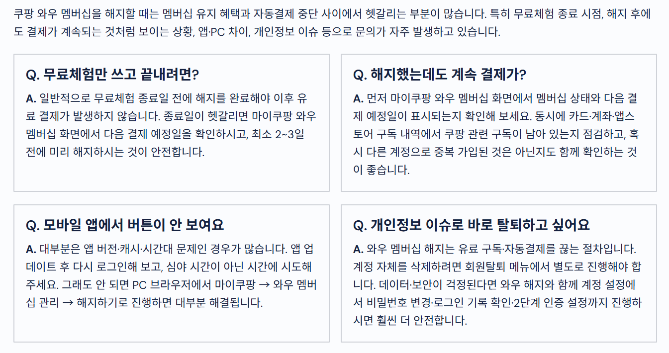 - 중간에 창을 닫은 경우: 해지 진행 중 안내 팝업을 닫거나 뒤로가기를 눌러 나온 경우, 해지 신청이 끝까지 완료되지 않았을 수 있습니다. 이때는 마이쿠팡 → 와우 멤버십 화면에서 해지 진행 상태를 다시 확인하고, 해지하기 버튼이 남아 있으면 처음부터 다시 진행해야 합니다.