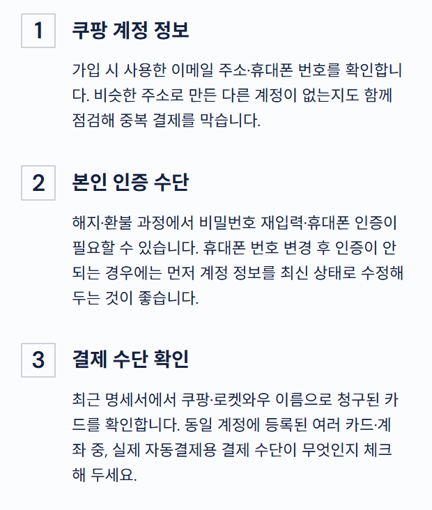 - 셋째, 카드·계좌·앱스토어 구독 내역에서 쿠팡 관련 자동결제 항목이 남아 있는지 확인하고, 필요하다면 각 결제 채널에서 구독 취소를 추가로 진행합니다.