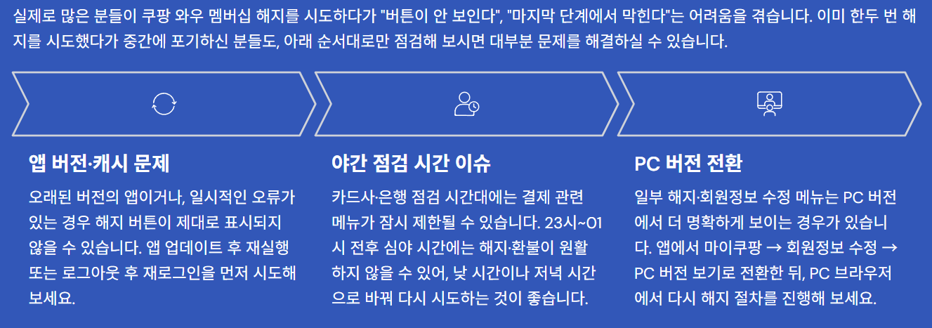 - Q. 모바일 앱에서 해지 버튼이 안 보여요. 강제로 막아 둔 건가요? A. 대부분은 앱 버전 · 캐시 · 시간대 문제인 경우가 많습니다. 앱 업데이트 후 다시 로그인해 보고, 심야 시간이 아닌 시간에 시도해 주세요. 그래도 안 되면 PC 브라우저에서 마이쿠팡 → 와우 멤버십 관리 → 해지하기로 진행하면 대부분 해결됩니다.