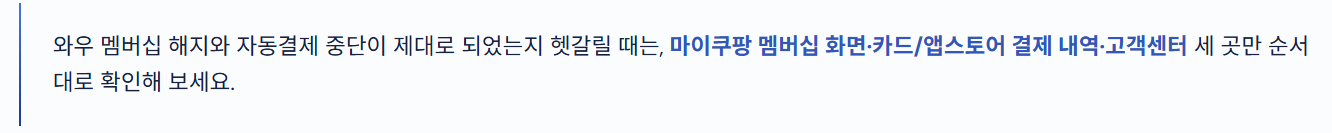 - 앱스토어 결제 여부: 쿠팡 앱이 아닌 구글 플레이 · 앱스토어를 통해 결제한 경우, 쿠팡 내에서 해지하더라도 실제 자동결제는 각 스토어 구독 관리에서 따로 해지를 진행해야 완전히 중단됩니다.