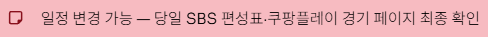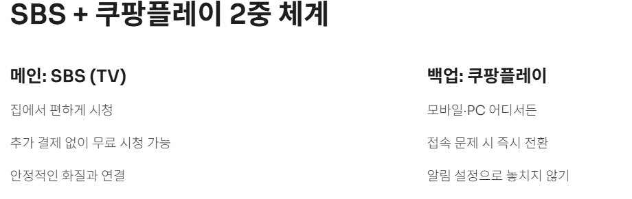 | 둘 다(메인+백업) | 비용보다 “시청 성공률”이 높음 | SBS 켜두기 + 쿠팡플레이 알림/대기 |