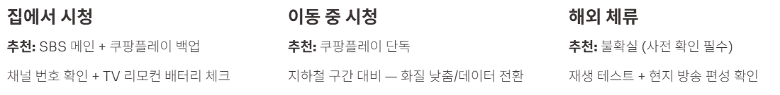 - 집/거실: SBS 메인 + 쿠팡플레이 백업(가장 안정적)