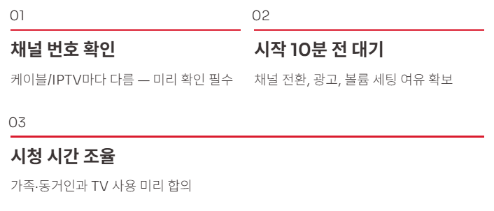 | SBS(TV) | 채널 번호 확인, 10분 전 대기 | 채널 충돌(가족/동거인) 사전 조율 |