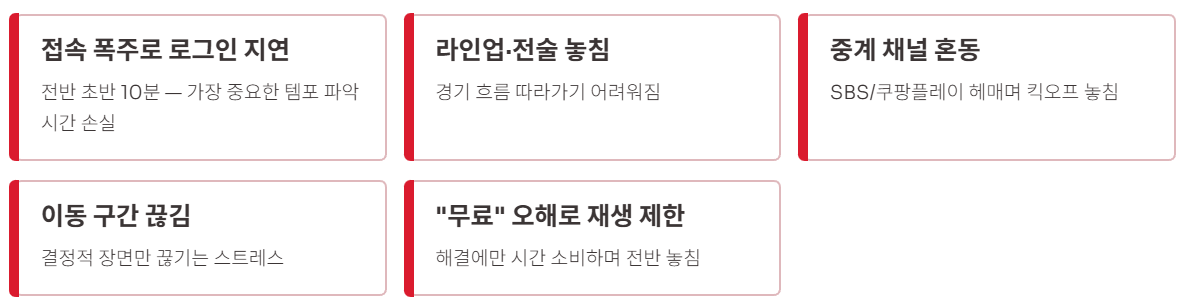 - 중계 채널 혼동으로 SBS/쿠팡플레이를 헤매며 시간 소모