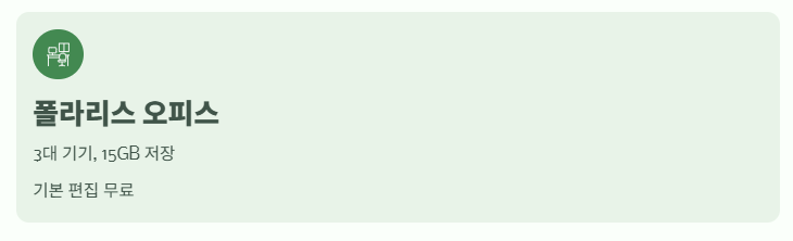 - 폴라리스 오피스 무료 플랜: 최대 3대 기기와 15GB 저장 공간까지 무료로 제공되어, 설치 부담 없이 여러 기기에서 문서를 열어 보고 간단히 편집할 때 적합합니다.