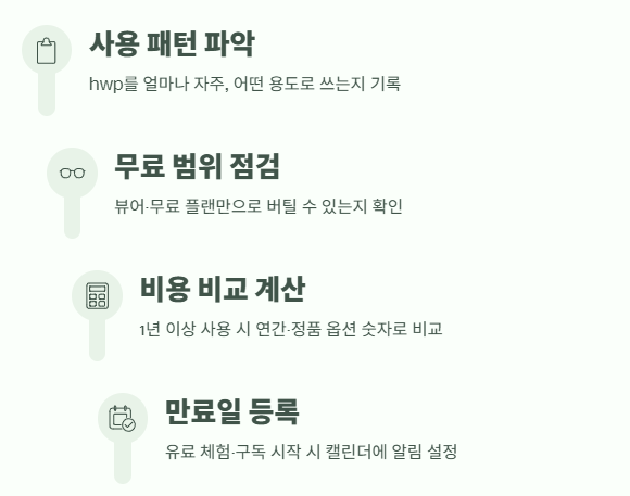 모든 사용자가 똑같이 한글을 설치하고 똑같이 돈을 쓰는 것이 정답은 아닙니다. hwp 문서를 한 달에 한두 번만 보는지, 매일 편집해서 제출해야 하는지, 아니면 영리 목적 프로젝트에 쓰는지에 따라 무료 전략과 유료 전략이 완전히 달라집니다.