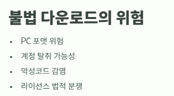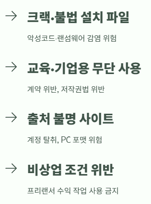 - 교육기관·기업용 라이선스: 학교·회사에서만 쓰라고 계약된 라이선스를 집 PC에 설치해 쓰는 행위는, 계약 위반과 저작권법 위반 위험을 동시에 안는 선택입니다.