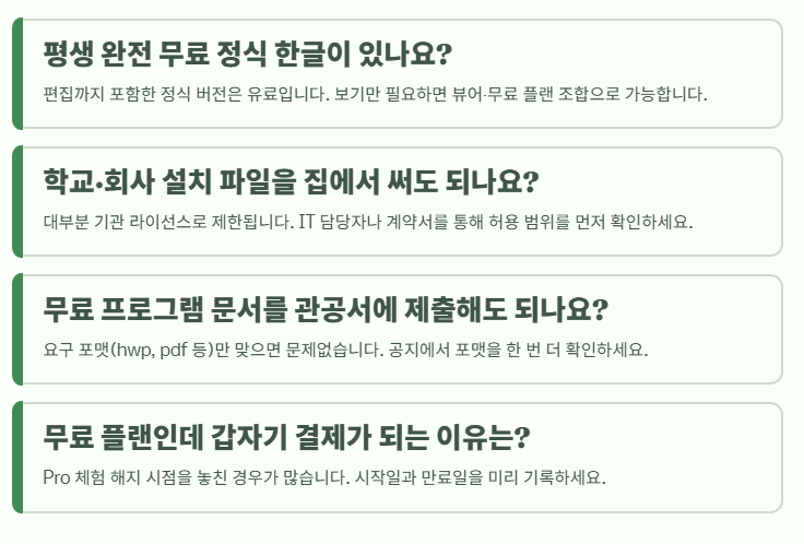 - 비상업적 사용 조건: 한컴오피스 뷰어처럼 “개인·가정용 비상업적 사용”에 한해 무료인 프로그램은, 프리랜서 계약서나 유료 강의 자료 제작처럼 수익과 연결되는 작업에는 쓰기 어렵습니다.