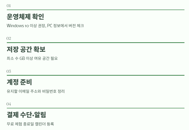 한글 관련 프로그램을 설치하기 전, 몇 가지 기본 조건을 확인해 두면 설치 오류나 중복 과금, 계정 혼선을 상당 부분 줄일 수 있습니다. 특히 노트북이나 회사 PC에서는 운영체제와 권한, 카드 등록 여부까지 미리 체크하는 것이 안전합니다.