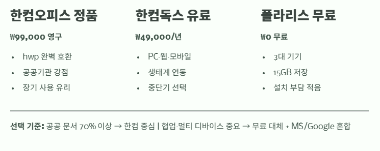 - 선택 전략: 공공기관·학교 문서가 잦다면 한컴 위주로, 협업·멀티 디바이스가 중요하다면 폴라리스·MS·Google을 섞고, 비용 부담이 크다면 무료 플랜과 한컴독스 연간 49,000원 옵션을 중심으로 설계하는 방식이 효율적입니다.